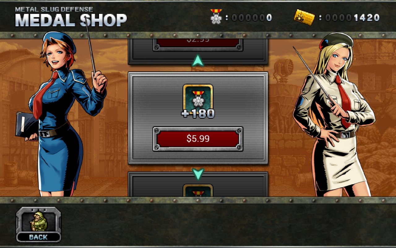 Questo titolo non ha nulla di così tanto originale da farlo spiccare nel vastissimo universo dei tower, se non l’essere parte dell’universo Metal Slug ,durante ogni missione accumuleremo AP che potremo usare per creare soldati e macchine sul campo di battaglia per respingere e contrattaccare il nemico ; ogni tipo ( e ce ne sono tanti) ha caratteristiche particolari e può essere potenziato ; ognuno di essi poi dopo un po’ di tempo sul terreno si illuminerà dando la possibilità di usare il suo attacco speciale ;